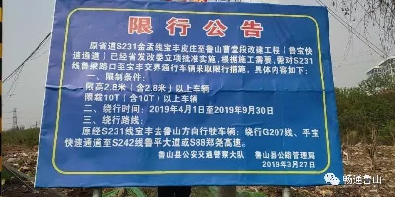 原省道S231金孟線寶豐皮莊至魯山曹堂段改建工程(魯寶快速通道)已經省發改委立項批準實施,根據施工需要,需對S231線魯梁路口至寶豐交界通行車輛采取限行措施,具體內容如下: