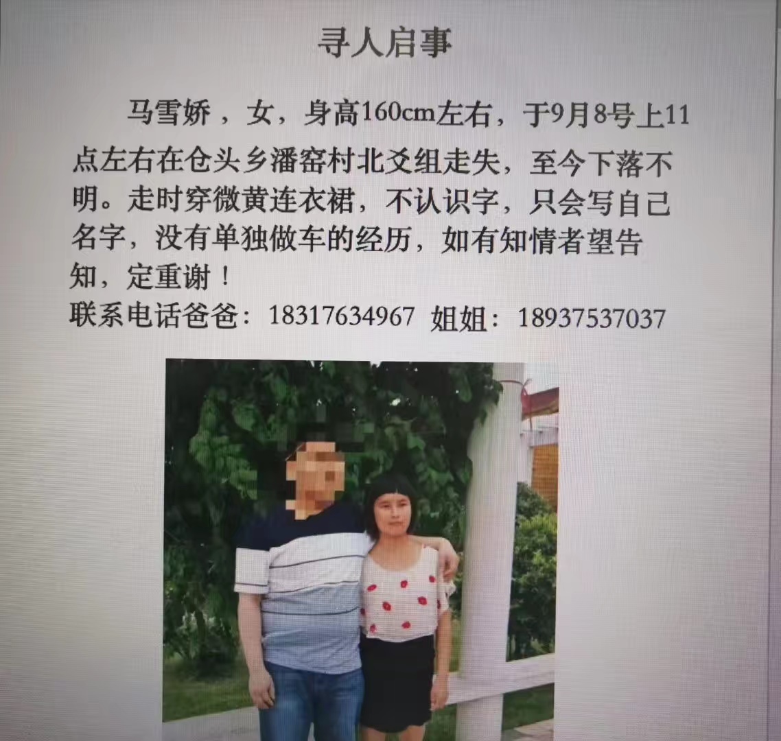 馬雪嬌 ,女,于9月8號上午Ⅱ點左右在倉頭鄉(xiāng)走失,不認識字,只會寫自己名字,沒有單獨做車的經(jīng)歷,至今下落不明,走時穿微黃連衣裙,知其下落者請告知定重謝, 望魯山縣各鄉(xiāng)鎮(zhèn)的朋友們相互轉(zhuǎn)發(fā)!在此謝謝各位親朋好友!!聯(lián)系電話爸爸18317634967姐姐電話18937537037,