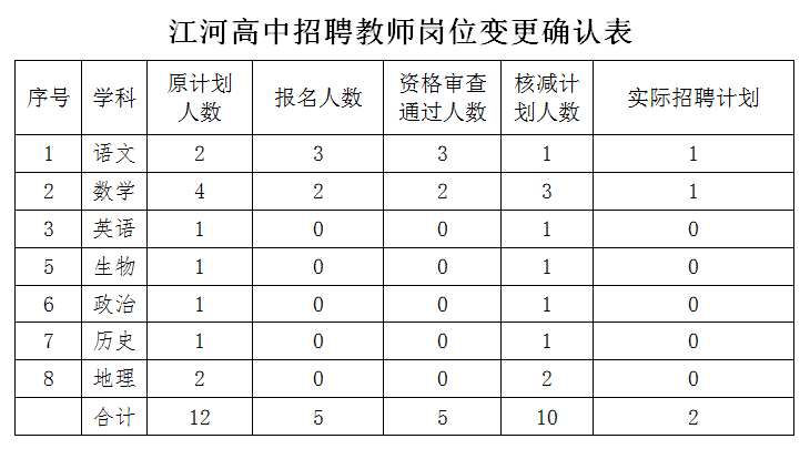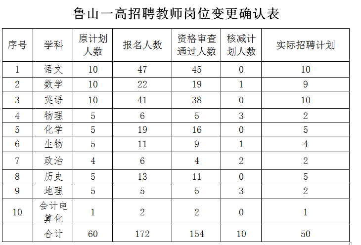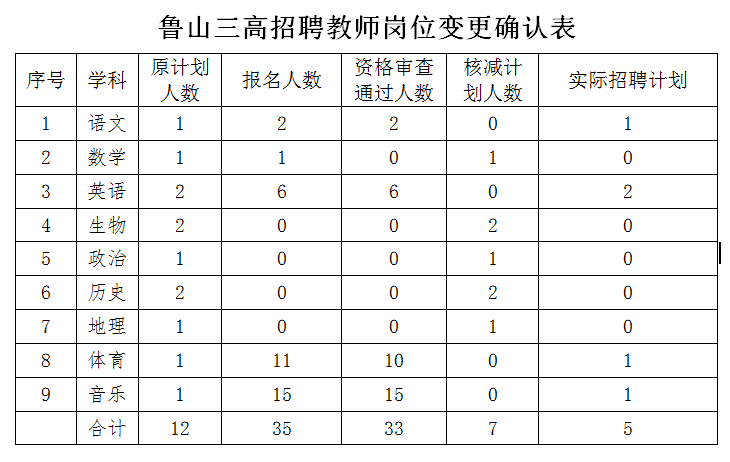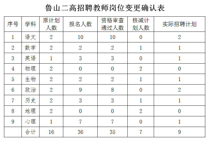 魯山縣2018年公開招聘事業單位人事代理普通高中教師報名工作及資格初審認證工作已經結束,按照《魯山縣2018年公開招聘普通高中教師工作實施方案》中“報名人數與各招聘崗位人數的比例原則上不低于3:1,緊缺學科不低于2:1,達不到2:1的將縮減本專業指標,按報名人數與招聘人數2:1確定招聘人數,報考人數不足2人的,該崗位不再招聘”的規定,現將四所高中招聘崗位計劃變更情況公布如下: