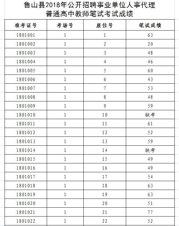 魯山縣2018年公開招聘事業單位人事代理普通高中教師考試筆試評卷工作已經結束,現將考生考試成績公布如下。如對成績有異議,考生本人可于7月10日下午6:00之前持準考證到魯山縣教育體育局人事科提出查分申請,過期不候。