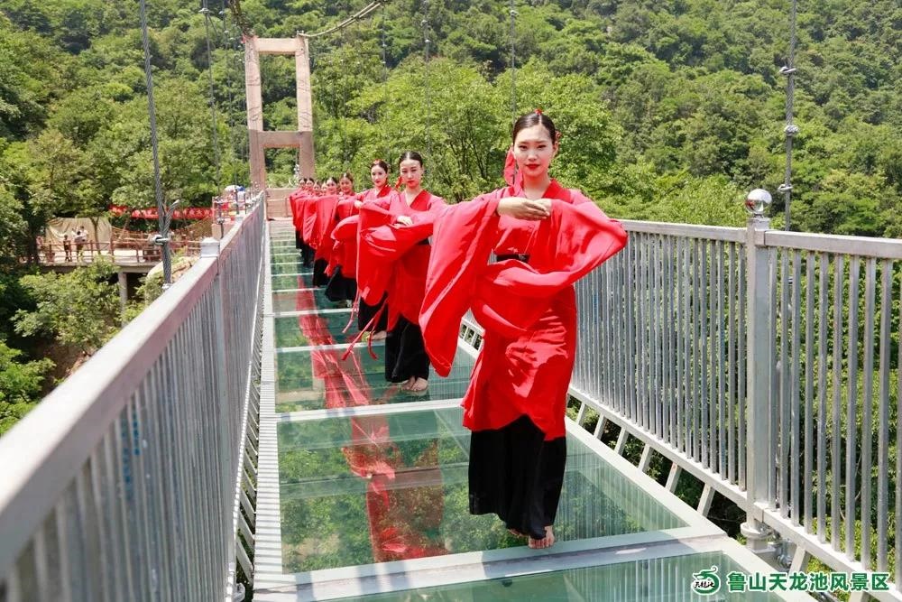 天龍池風(fēng)景區(qū)玻璃天橋全長(zhǎng)216米,橋體采用三層安全夾膠透明玻璃,行走在橋面上,橋下風(fēng)景“一覽無余”,刺激無比。由于玻璃橋建造于兩座高山之間的峽谷中,行走在橋上,山巒起伏盡收眼底,站在全透明的玻璃橋上眺望遠(yuǎn)方更是能體味到不同的刺激與感受!