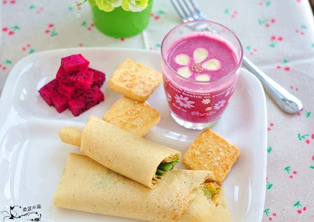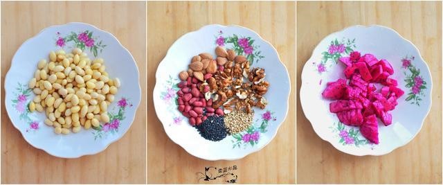 配料:黃豆200克 核桃30克 黑芝麻5克 白芝麻5克 杏仁10克 花生10克 紅心火龍果200克 奶酪片5克
