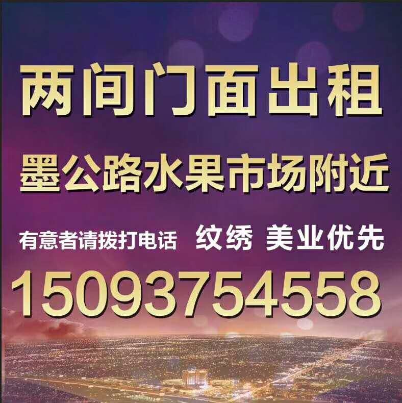 墨公路,水果市場(chǎng)北路東現(xiàn)有兩間門面出租,(尋求美業(yè)合作伙伴)有意者可直接聯(lián)系,餐飲業(yè)勿擾,紋繡,美業(yè)優(yōu)先