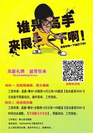 負責公司視頻剪輯處理,有相關經驗者優先,沒有經驗的話可以入職帶薪培訓,工作輕松。