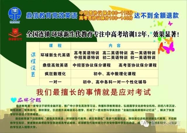鼎信高效英語,中招簽協議保分80—115分,高考簽協議保分100—140分,達不到全額退款!