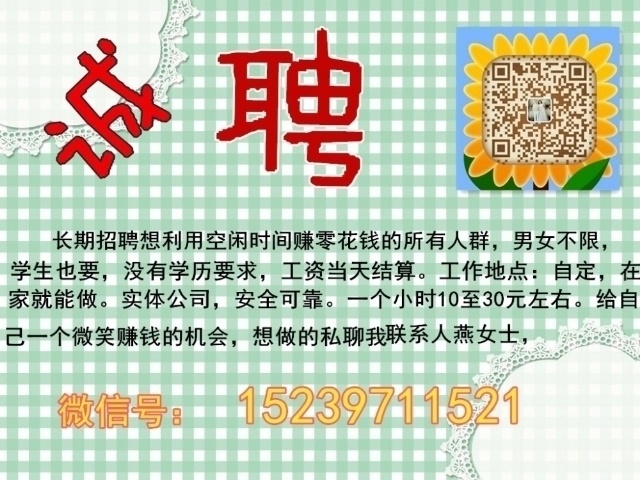 招聘假期工 7人 ,18-45歲之間,男女不限,勤勞肯干,咨詢電話15239711521微信同步,盡量加微信咨詢