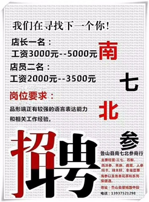 魯山縣南七北參商行是一家主要以經(jīng)營(yíng)三七、石斛、西洋參、天麻、鹿茸、人參、瑪卡、辣木籽、冬蟲夏草、海參以及各類花茶和系列保健酒的商行,為商行發(fā)展現(xiàn)誠(chéng)聘店長(zhǎng)一名、營(yíng)業(yè)員兩名:
