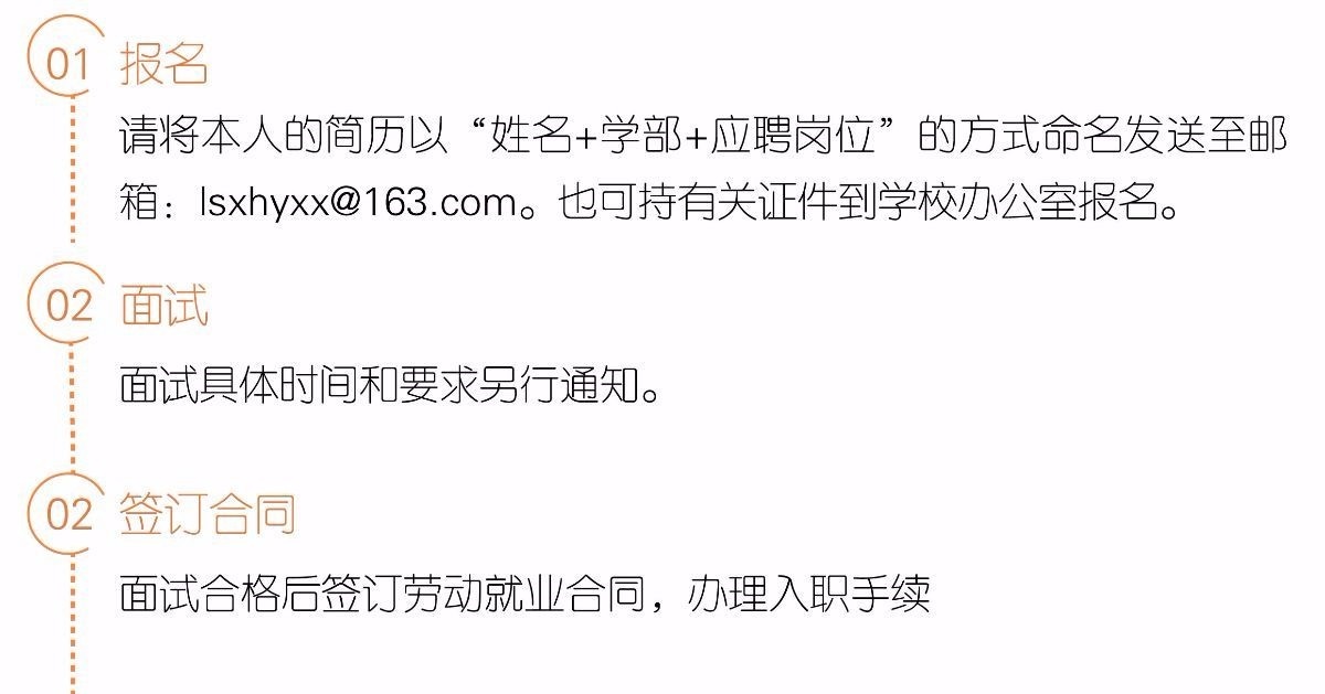 應(yīng)往屆優(yōu)秀師范類本科畢業(yè)生,非師范類須有教學(xué)經(jīng)驗者,曾擔(dān)任校(系)學(xué)生會干部以及獲得過優(yōu)秀學(xué)生獎學(xué)金的畢業(yè)生優(yōu)先錄用,音樂教師有編舞、舞臺表演經(jīng)驗者優(yōu)先錄用。