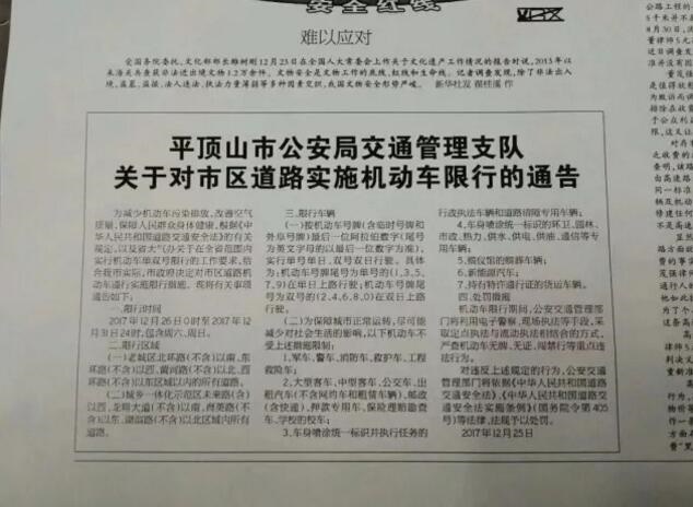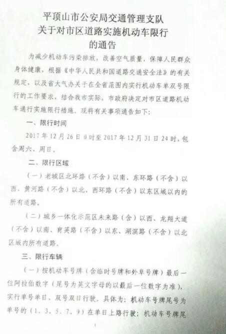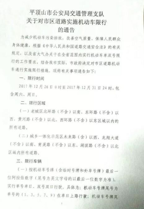 緊急通知:根據省大氣辦關于在全省范圍內實行機動車單雙號限行的工作要求,自2017年12月26日至31日,在市區范圍內實施機動車(含外埠車輛)單雙號限行,機動車號牌尾號為單號的(1、3、5、7、9)在單日上路行駛;機動車號牌尾號為雙號的(2、4、6、8、0)在雙日上路行駛。限行區域不變,限行時段為每日0時至24時。請廣大人民群眾嚴格遵守新的限行政策,綠色出行,低碳出行。